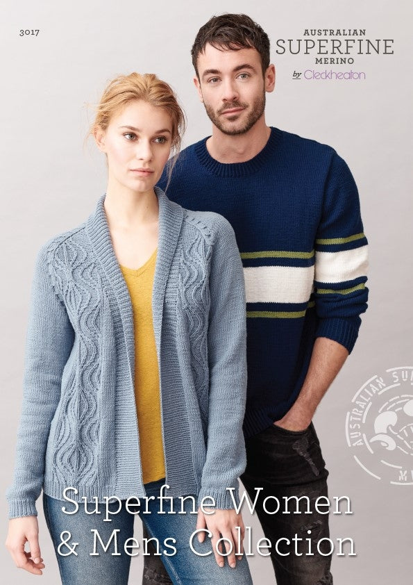 Superfine Women and Mens Collection 3017 has 5 gorgeous knits in Cleckheaton Superfine Merino 8 and 4 ply.